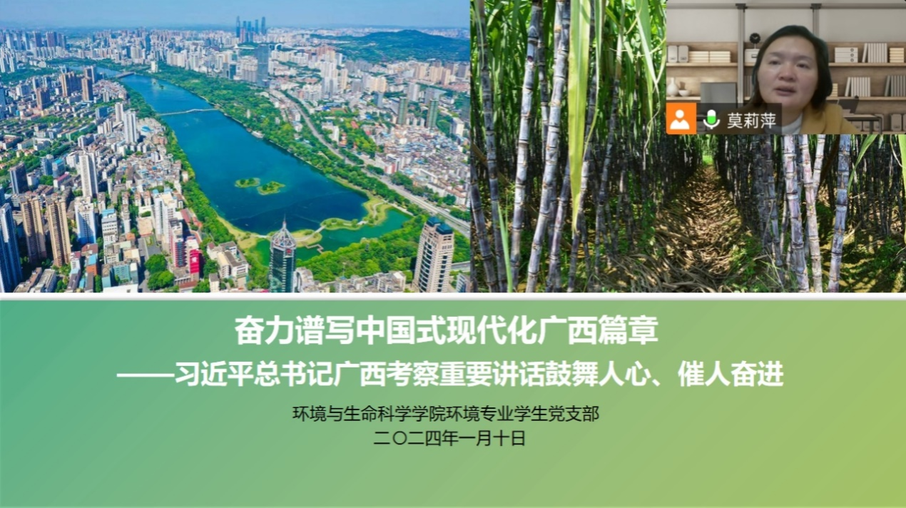 环境专业学生党支部于2024年1月10日晚通过腾讯会议开展主题为“奋力谱写中国式现代化广西篇章”主题党课学习。参会人员为环境专业学生党支部全体党员,本次会议由环境专业学生党支部书记莫莉萍主持。