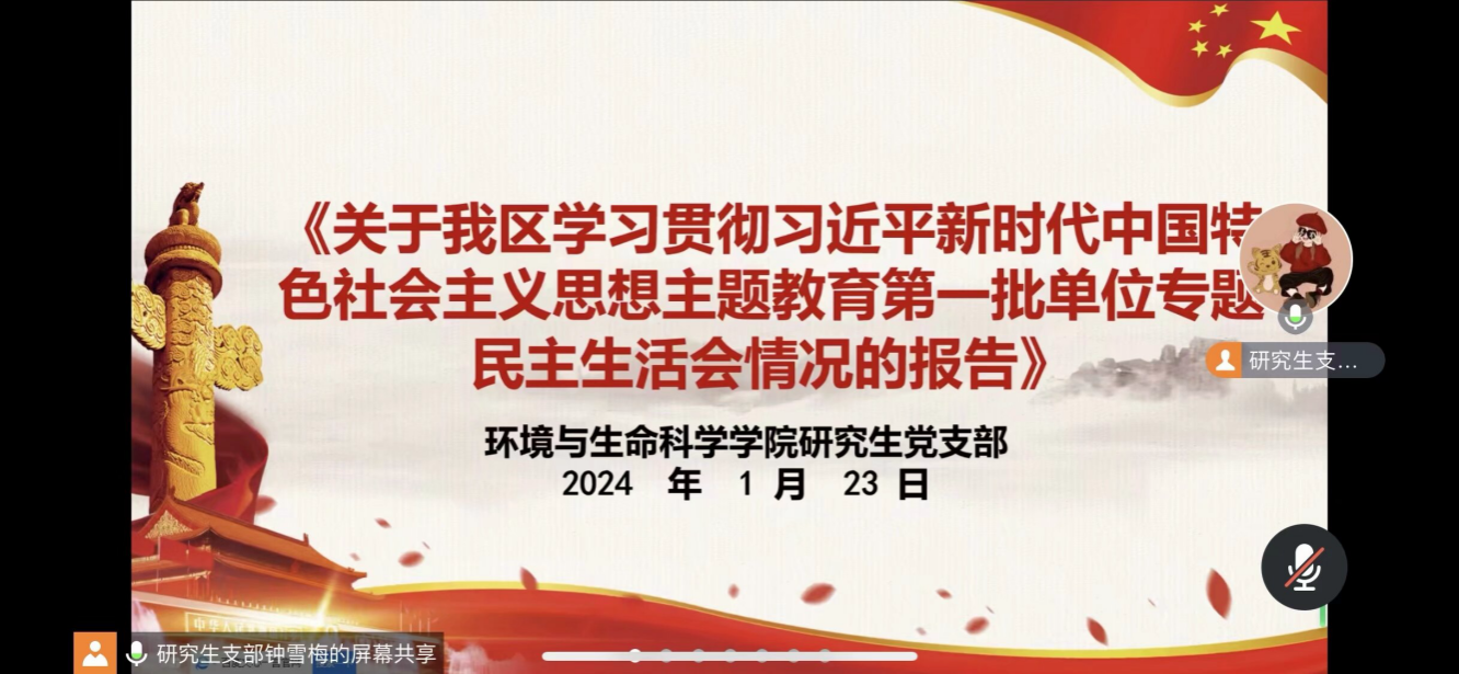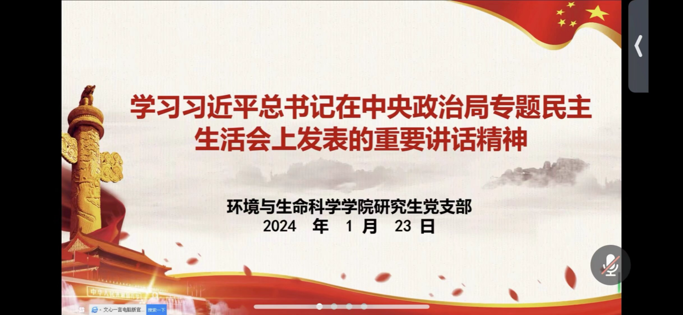 研究生党支部于2024年1月23日晚开展了“习近平在中央政治局专题民主生活会上的讲话”主题党课培训。本次会议参会人员为研究生党支部全体党员,此次培训课程由党支部书记钟雪梅主持。