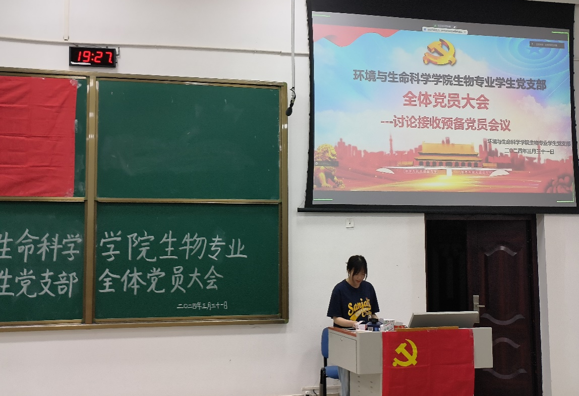 生物专业学生党支部于2024年3月31日晚上19:30在武鸣校区地海楼B109教室召开预备党员接收会议。本次会议采取线上线下相结合的方式,会议主要议题是讨论韦臻、周若琳2名发展对象接收为预备党员的问题,参会人员有 黑料不打烊