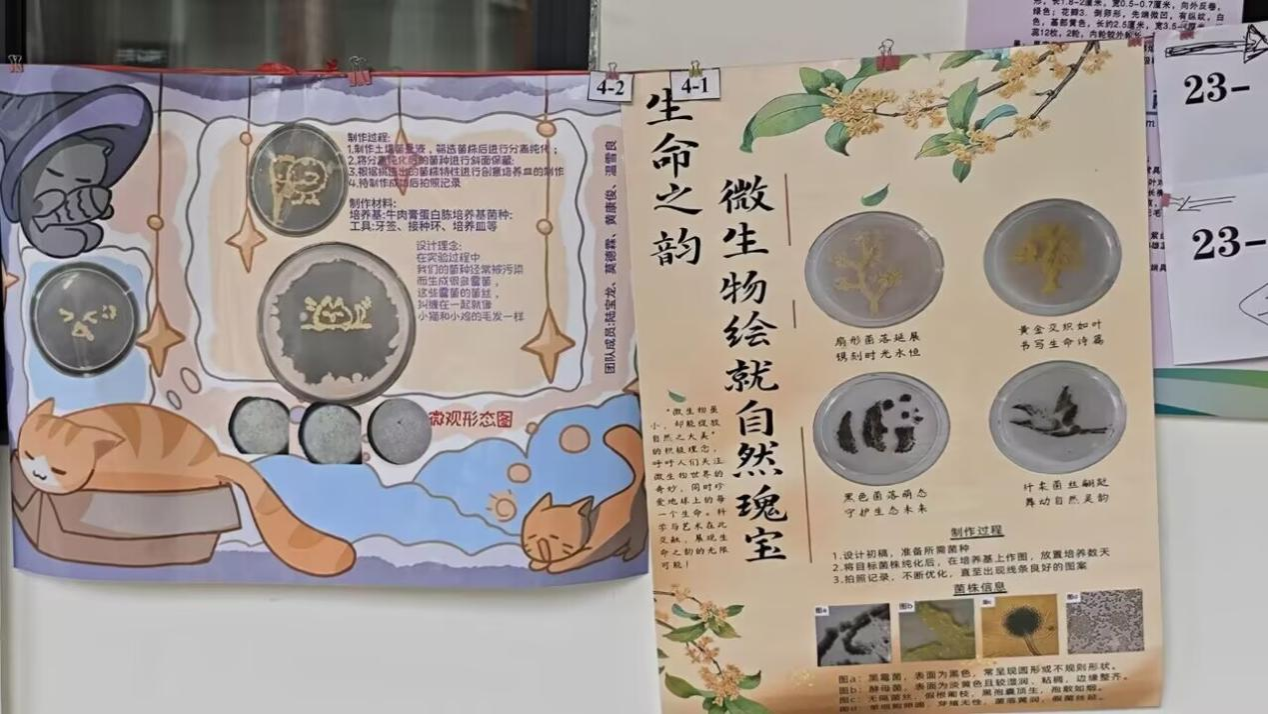 这些栩栩如生的作品让参观者深刻感受到了微观生命绽放的独特魅力。此次作品展突破传统实验框架,将家国情怀、课程思政与专业知识有机融合,让专业知识转化为可视化艺术表达,充分展现了生物学子的专业素养和创新潜力,进一步激发了同学们对微生物学科的探索热情,为跨学科实践教学提供了新范本。