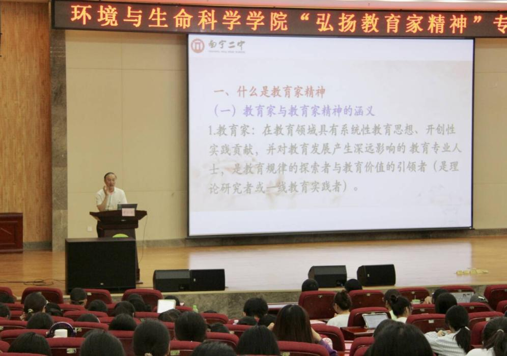 于7月4日在武鸣校区图书馆报告厅举办“弘扬教育家精神”专题讲座,本次讲座特邀南宁市第二中学校长黄幼岩担任主讲嘉宾。学院院长何英姿、教师代表、学科教学(生物)专业研究生及生物科学(师范类)本科生共同聆听了这场关于教育理念与精神传承的精彩讲座。