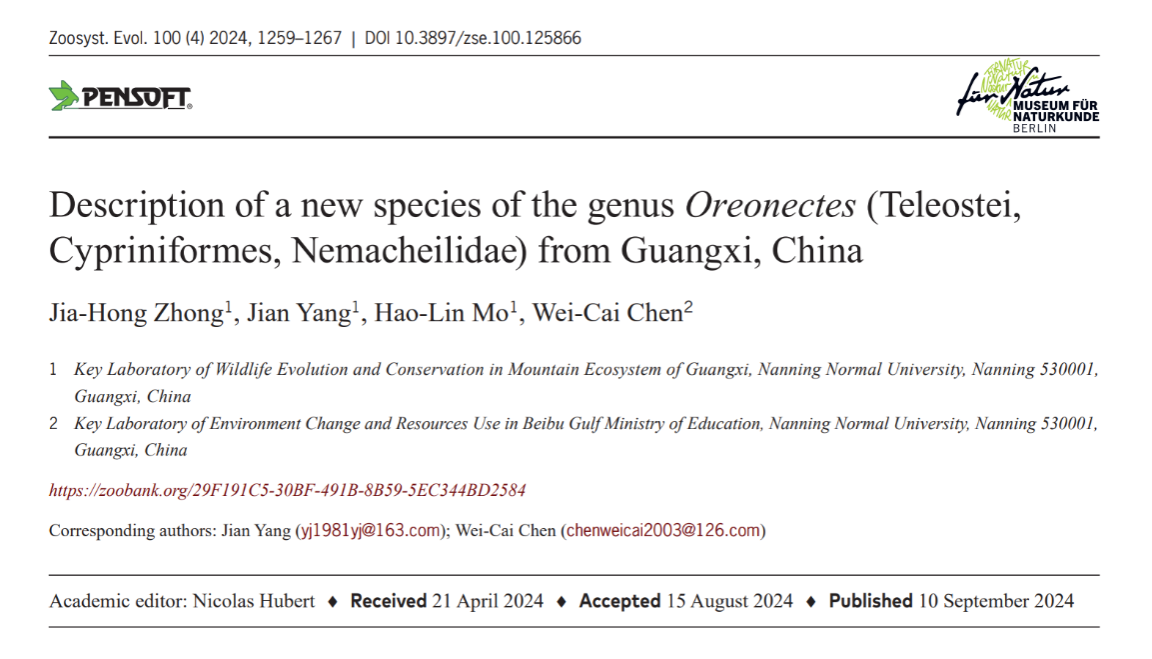 2021级生物科学专业本科生钟佳宏同学(第一作者)在SCI期刊《Zoosystematics and Evolution》(影响因子1.6,JCRQ2,中科院二区)上发表了题目为《Description of a new species of the genusOreonectes(Teleostei, Cypriniformes, Nemacheilidae) from Guangxi, China》的研究论文。2021级生物科学专业莫昊霖同学为本文共同作者。该论文在 黑料不打烊