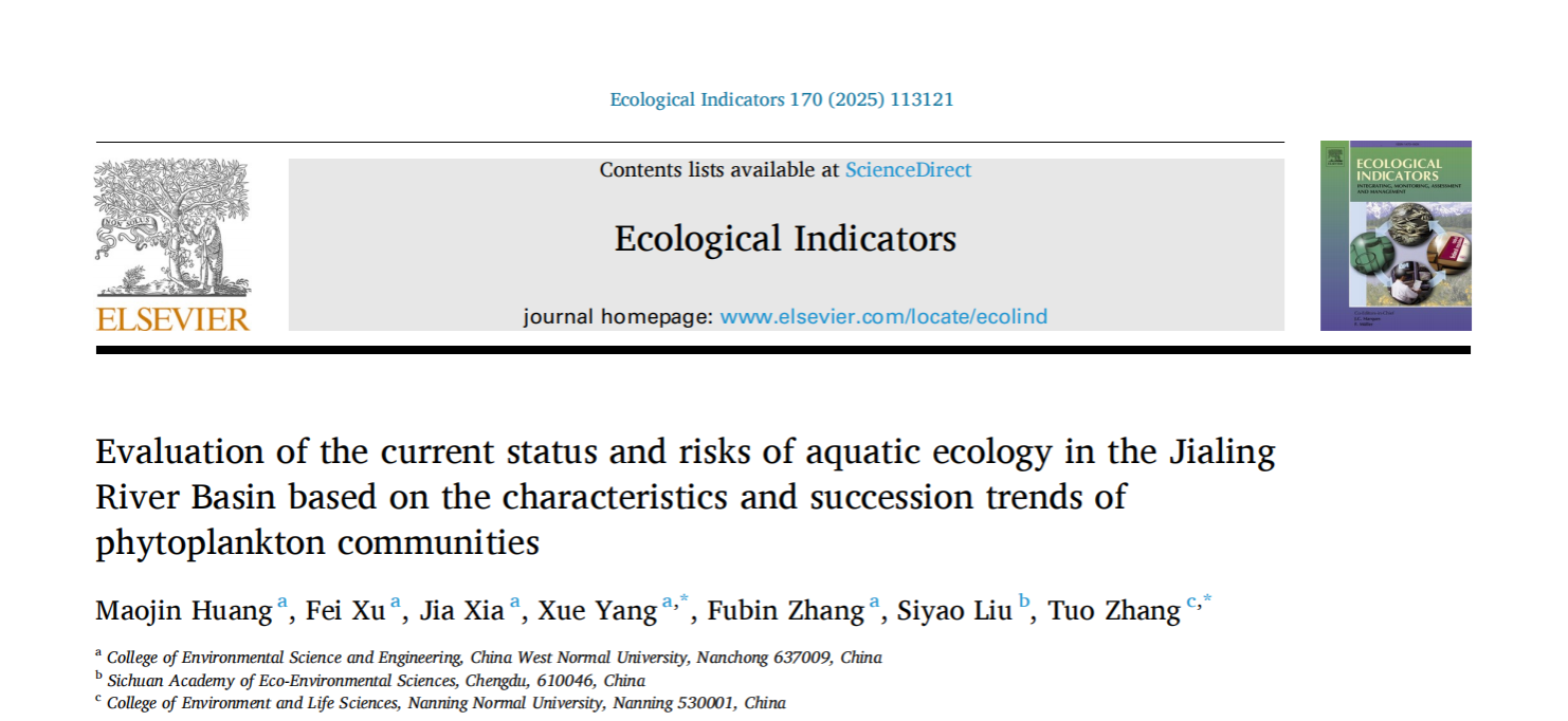 上述研究成果科研成果以“Evaluation ofthe current status and risks of aquatic ecology in the Jialing River Basin based on the characteristics and succession trends of phytoplankton communities.”为题,在环境科学与生态学领域著名期刊《Ecological Indicator》(中科院JCR双1区Top期刊,IF=7.0)上发表。西华师范大学环境科学与工程学院2022级本科生黄茂锦为第一作者(张拓副教授原单位指导的本科生),南宁师范大学为主通讯单位,张拓副教授为论文主通讯作者。该研究得到四川省生态环境科学院科技创新项目(ZX-2022080)、长江环境保护研究计划(2022-LHYJ-02-0509-09)等项目的支持。