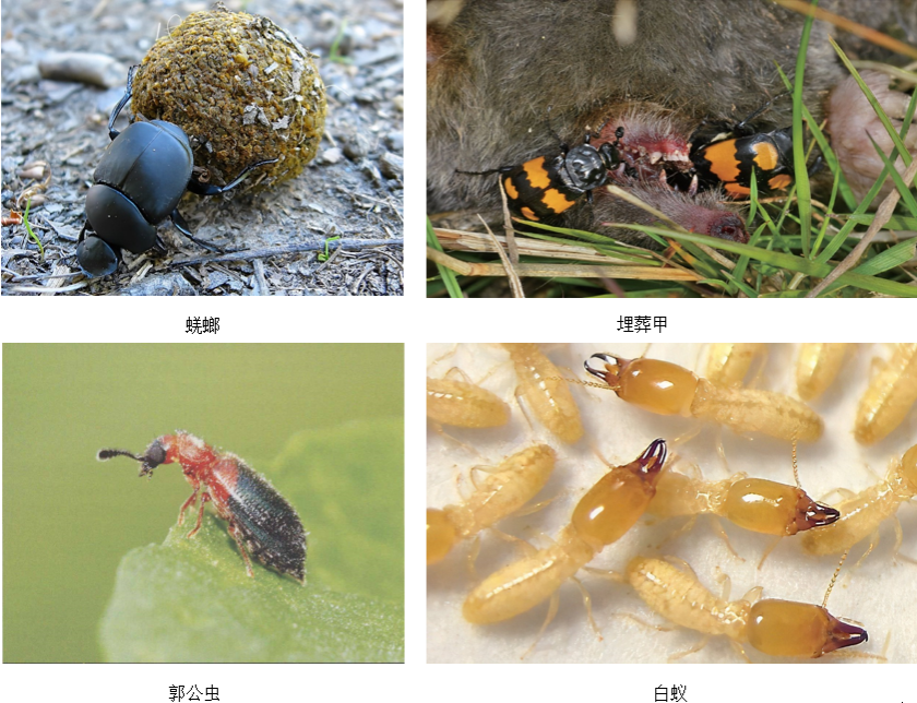 腐食性昆虫:大家所熟知的腐食性昆虫有蝇的幼虫(蛆)、蜣螂(屎壳郎),除此之外还有甲虫中的埋葬甲、隐翅虫、郭公虫等,等翅目中的白蚁等等。