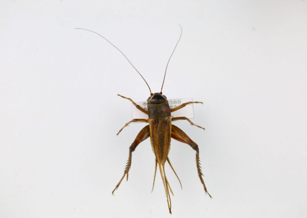 直翅目蟋蟀科。中大型种类,头部有浅色的、像眉毛一样的条纹。从头部背面看,两条触角呈“八”字形,触角窝四周黑色。前胸背板黑褐色,有左右对称的淡色斑纹,侧板下半部淡色。前翅背面褐色,有光泽,侧面黄色。