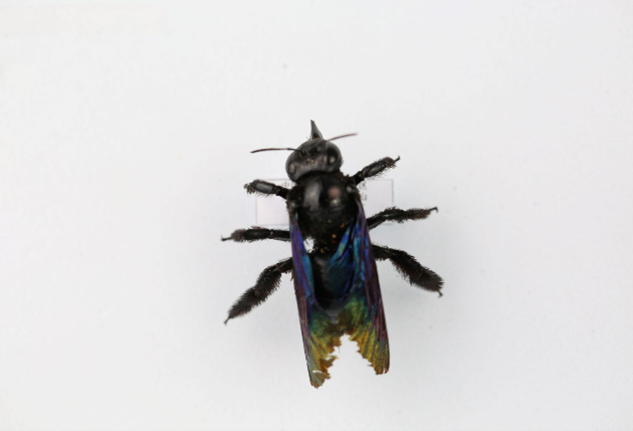 膜翅目蜜蜂科。雌体长23~24mm,黑色。头宽于长,上颚2齿嘴部前方的唇基略微弯曲,额部有明显的脊状隆起。最引人注目的是它的翅膀闪耀着蓝紫色的金属光泽,翅基片为黑色。身体上的毛发较少且呈黑色,仅在中胸背板边缘和侧板处覆盖着较密的绒毛。雄性体型稍大,约27~28mm,与雌性相似但更具特色:它们的唇基(除前缘外)、眼睛两侧以及头部中央单眼两侧有着醒目的黄色新月形斑纹,胸侧还夹杂着灰白色毛发。