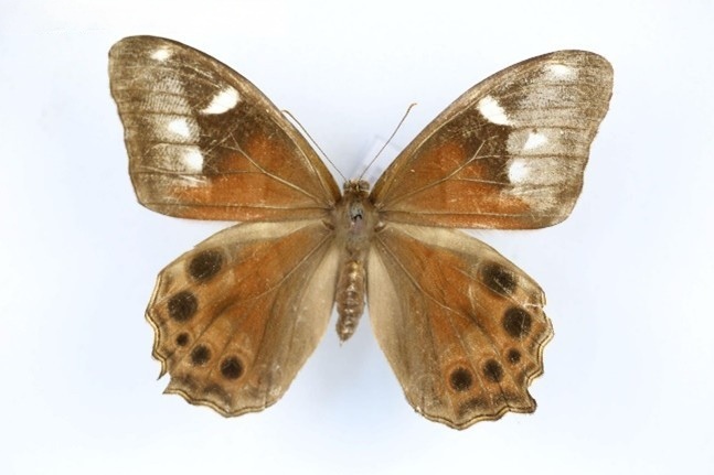 雄蝶翅面低调朴素,而雌蝶前翅却装饰着醒目的白色斜带,宛如系着一条时尚的“银色领带”。幼虫是“专一的素食主义者”,只钟情于取食禾本科的竹叶,它们会在叶片上慢慢成长,从一龄到五龄,期间甚至会长出有趣的小角。南方常见眼蝶,多在林区以及竹林活动。分布于华东、华南、西南、中南。