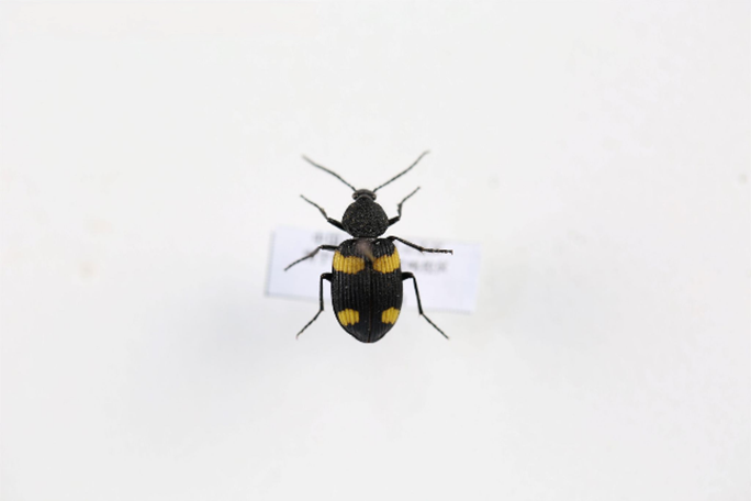 鞘翅目步甲科。体长16~18mm,黑色,有光泽,密被绒毛。鞘翅具2个边缘齿形的黄色斑,前斑横行,后斑近圆形。前胸背板近六角形,上面有粗糙的凹点,基部边缘略宽于前缘,最宽处约在中部,基部的凹陷较深,中间的线条很明显。鞘翅长卵形,条沟内具凹点,行距隆起。足胫节有纵行脊,第4跗节背面双叶状。