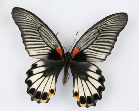 鳞翅目凤蝶科。大型风蝶,后翅具白色斑块,占据5、6、7室,但不进入4室。后翅臀角至少有一个清晰的红色月牙状斑纹,翅膀反面靠近外缘的斑点列也是红色的。