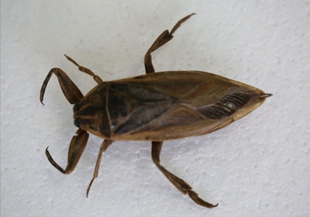 半翅目负蝽科。体扁平宽大,呈椭圆形,灰褐色,体长45~65mm。头小呈三角形,口器短但有力;触角小,前胸大。前翅革质发达,后翅膜质淡黄色。前足强壮,跗节短具1钩爪;中后足胫节、跗节具长毛,足端有2长爪。