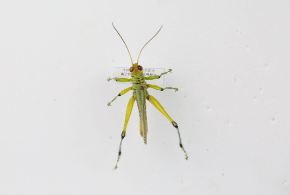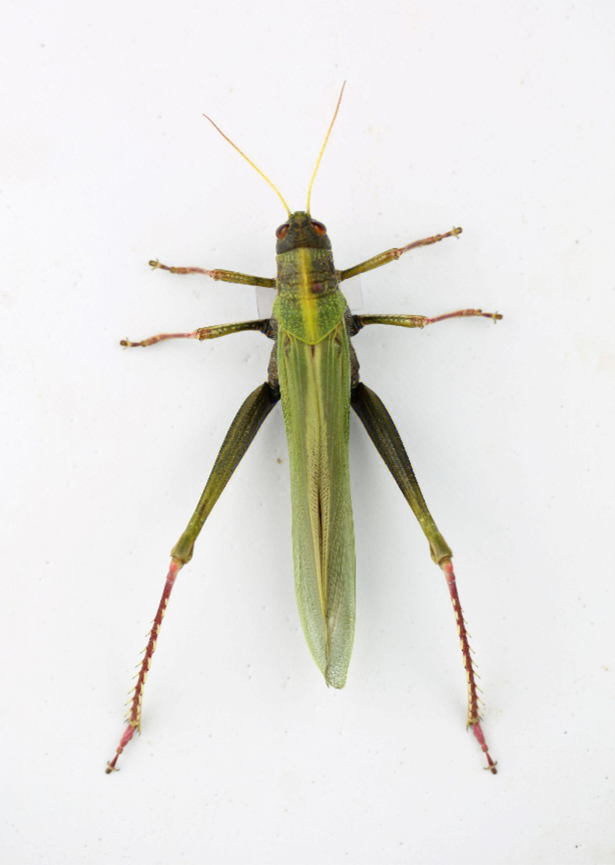 直翅目斑腿蝗科。体型巨大的纯绿色蝗虫,面部及前胸具少量淡色条纹,后足胫节淡红色具白色大刺。