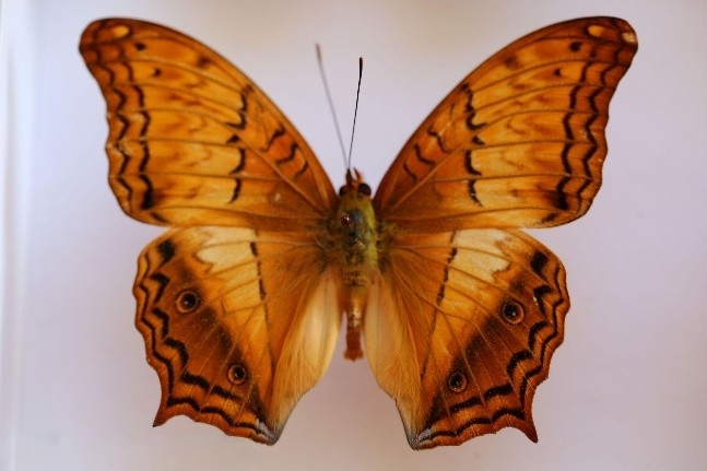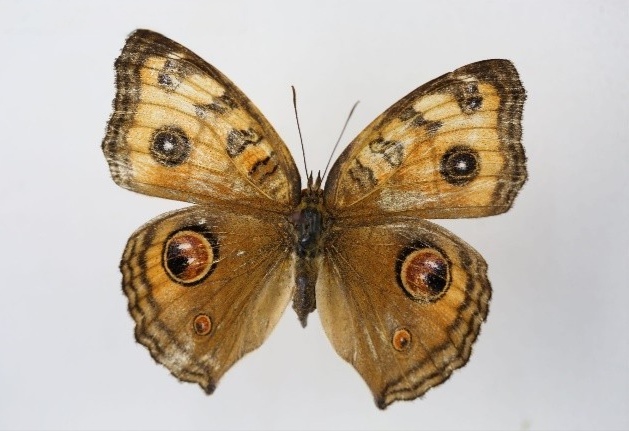 鳞翅目蛱蝶科。翅膀正面是橙黄色的,前翅和后翅上都有大大的、像孔雀眼睛一样的斑点。季节型差异较大,高温型翅反面土褐色,低温型则为深褐色或棕褐色。雌雄蝶前翅近顶角均有1条短斜带。