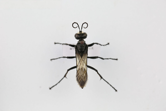 膜翅目泥蜂科。体长20~30mm,黑色;头部被银白色毡毛;胸部背板软毛较稀;上颚宽大,具2内齿;唇基横宽,边缘圆润光滑;头顶具分散的小凹点;唇基和前额密被毛。