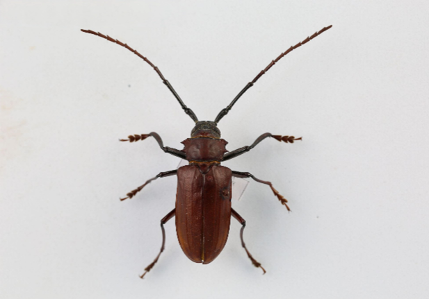 鞘翅目天牛科。体长15~65mm,体型大且个体差异悬殊,棕红色,前胸背板色深,头、上颚及触角基3节黑褐至黑色。雄虫触角粗大扁阔,达鞘翅末端,第3~7节下沿有齿状颗粒:雌虫触角细小,达鞘翅中部之后。前胸背板宽,两侧缘各有3尖锐齿突,背板表面布满了细密的小凹点。鞘翅宽于前胸,两侧近平行、端部渐窄,外端角圆,缝角垂直,每翅显2~3条纵脊线。雄虫前足胫节腹面有数列齿状突。