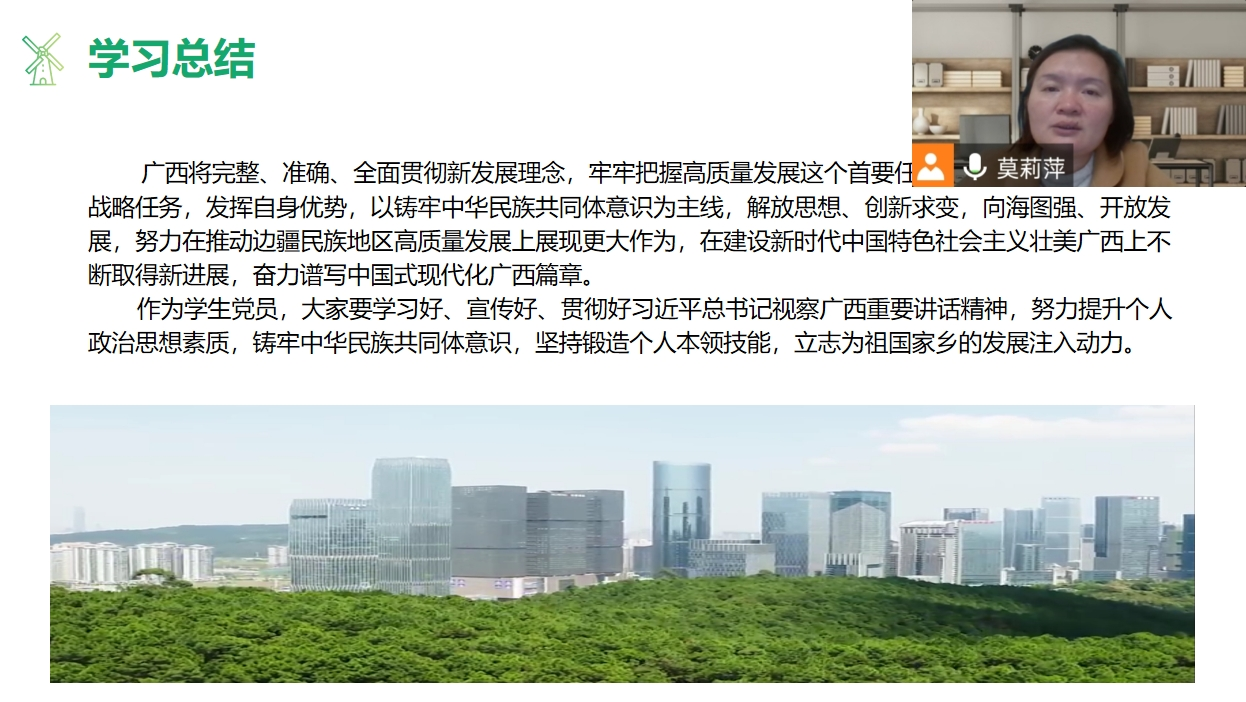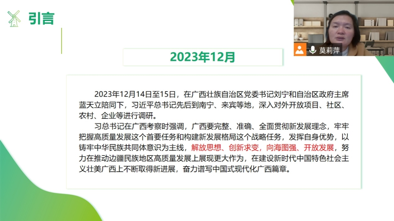 环境专业学生党支部于2024年1月10日晚通过腾讯会议开展主题为“奋力谱写中国式现代化广西篇章”主题党课学习。参会人员为环境专业学生党支部全体党员,本次会议由环境专业学生党支部书记莫莉萍主持。