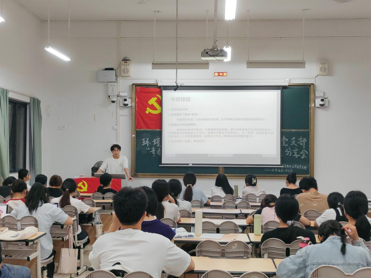 生物专业学生党支部于2025年5月17日晚在武鸣校区1号教学楼117教室开展2025年“青春筑梦,研途领航”考研经验分享会。