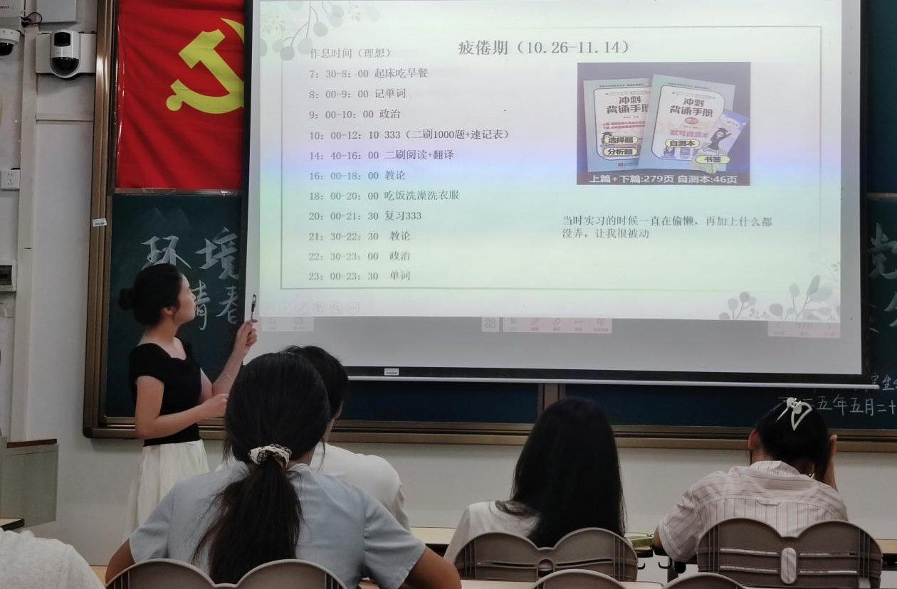会上,五位成功考研上岸的学生围绕考研全流程分享经验。考取云南大学的徐畅介绍考研报名流程,推荐参与高校夏令营;被广西师范大学拟录取的李秋分享专业课复习方法,提出考研复习可以结合网课学习、刷题与真题训练;考入海南师范大学的廖真承剖析了专业课各题型的答题技巧;考取本校的陆佳丽分享各阶段学习方法与心态调整经验;上岸兰州大学的邱洵聚焦考研复试,建议同学们提前模拟面试,充分准备专业问答。