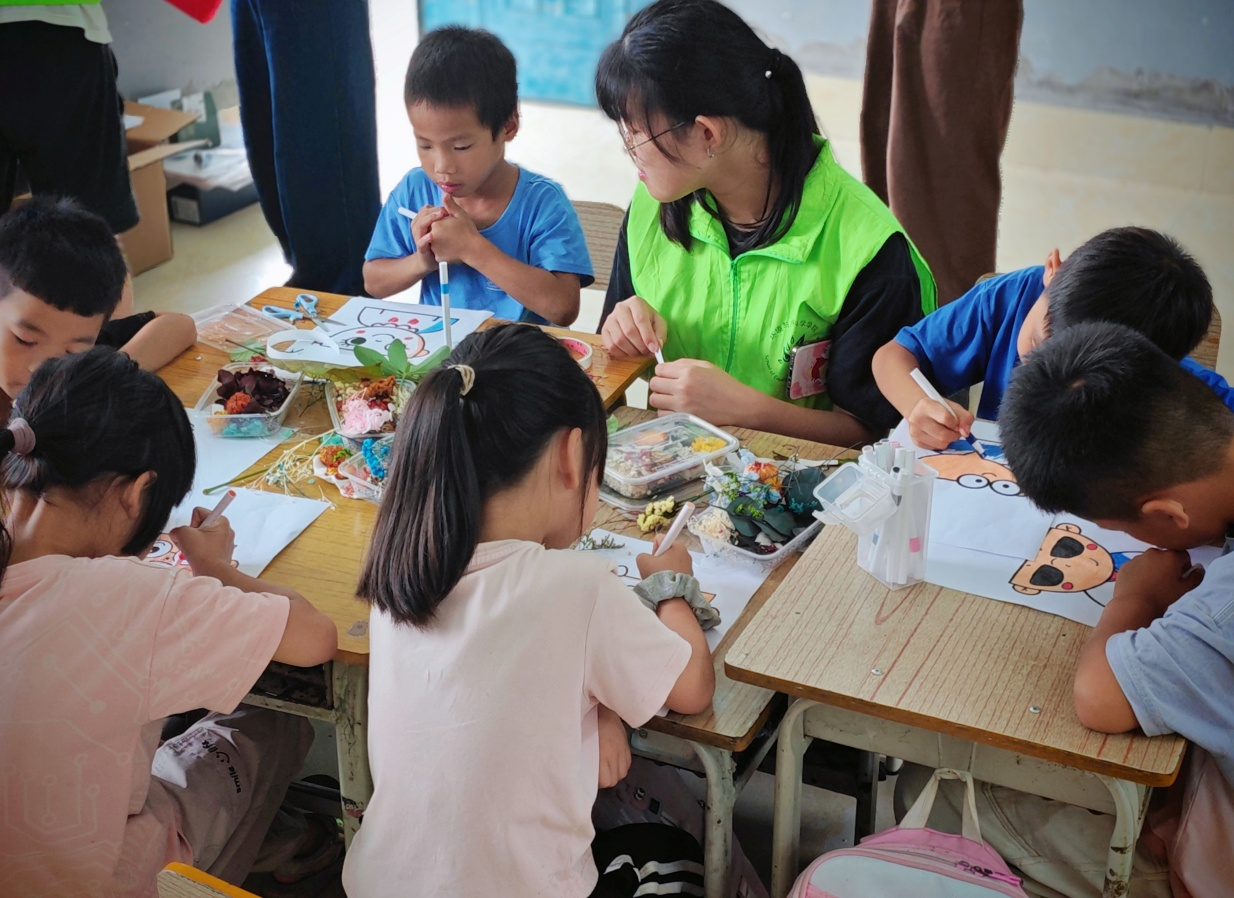 宣讲结束后,党员们组织了“记忆叶片”“风铃黏土”“春日造型师”三大实践活动。在“记忆叶片”环节,小朋友们通过记忆植物叶片名称参与投壶游戏;在“风铃黏土”与“春日造型师”活动中,小朋友在党员同志们的帮助下,利用干花、黏土、卡纸等材料进行艺术创作,在娱乐的过程中加深了小朋友们对生物多样性保护的认识与理解。