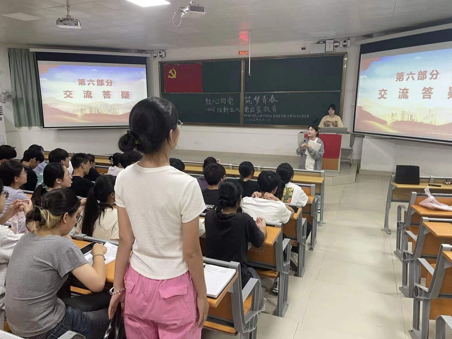 主持人还结合学院实际,详细介绍了党支部的组织结构、入党流程以及入党申请书的撰写要求。在答疑环节,新生积极提问,支部党员一一耐心解答,帮助大家进一步明确入党相关程序与要求。