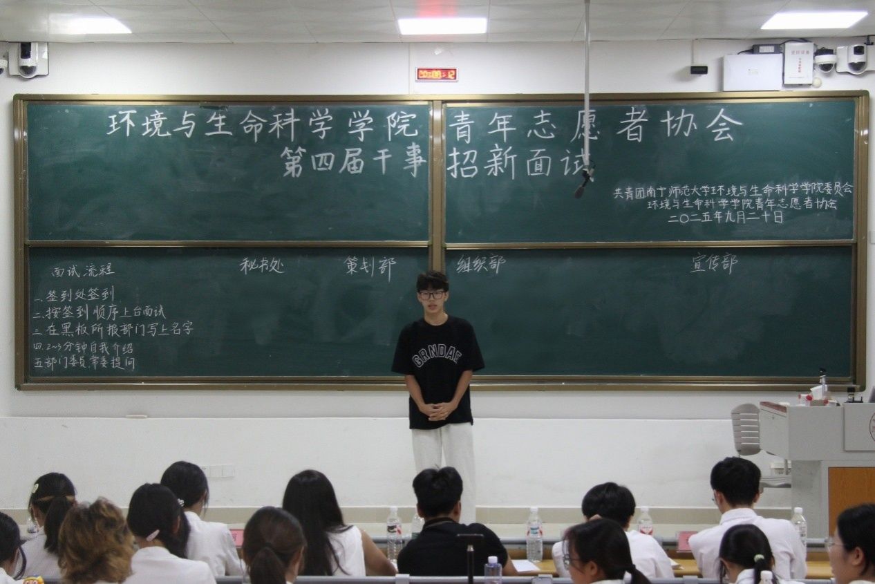 青年志愿者协会第四届干事招新面试在武鸣校区一号教学楼115教室圆满完成。本次招新面试工作由学院辅导员甘佩萍、骆亮城,院青协常委团会长蓝国莲、秘书长欧亚丽、副会长蒙雨昕及全体委员共同参与。面试旨在选拔一批有热情、有担当、有能力的同学加入青协,为协会注入新鲜血液,推动志愿服务工作持续提升与创新。