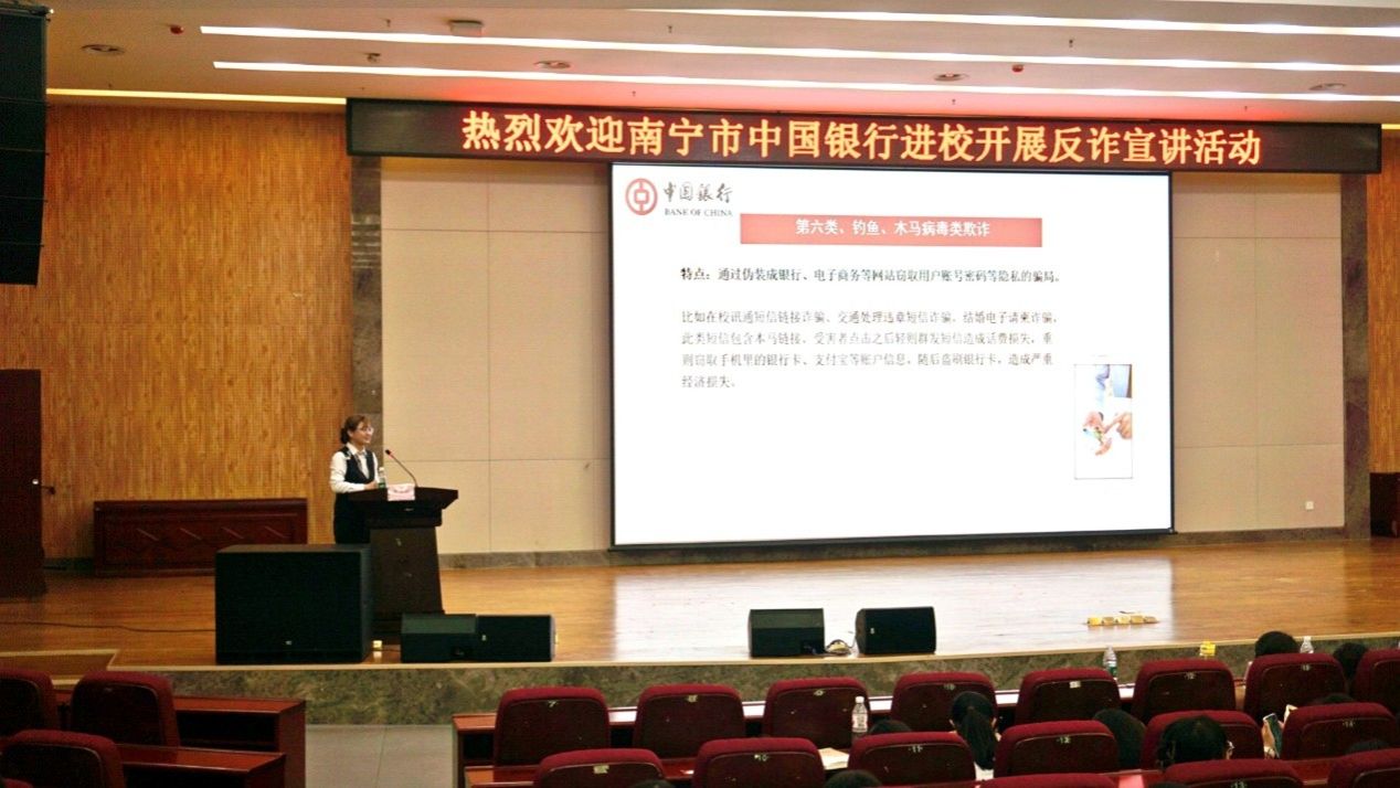 联合中国银行在武鸣校区图书馆报告厅为25级新生举办反诈主题宣讲活动。学院党委副书记刘启满、梁洲辅教授、辅导员甘佩萍,中国银行南宁分行明秀东支行行长刘君丽、西乡塘支行副行长黄锦胜、武鸣支行副行长李丹等一行人员,以及2025级全体新生共同参与了活动。