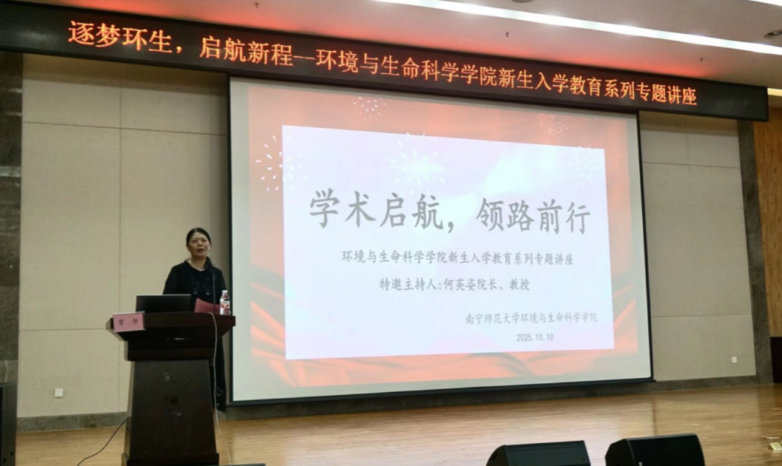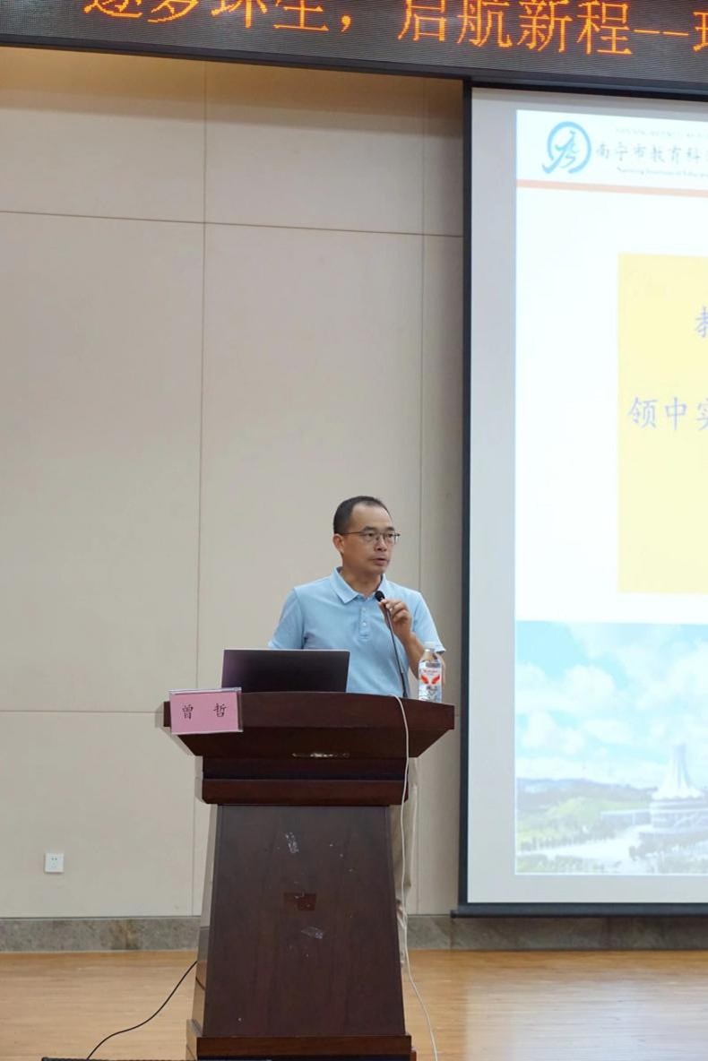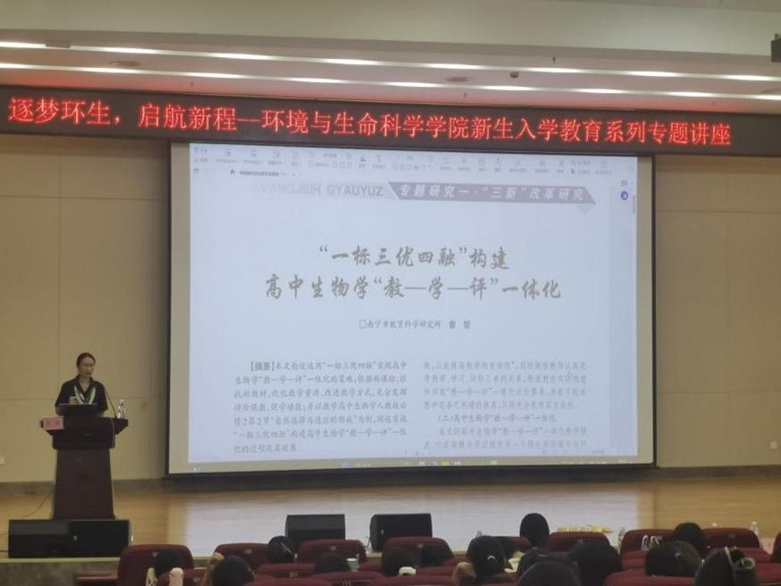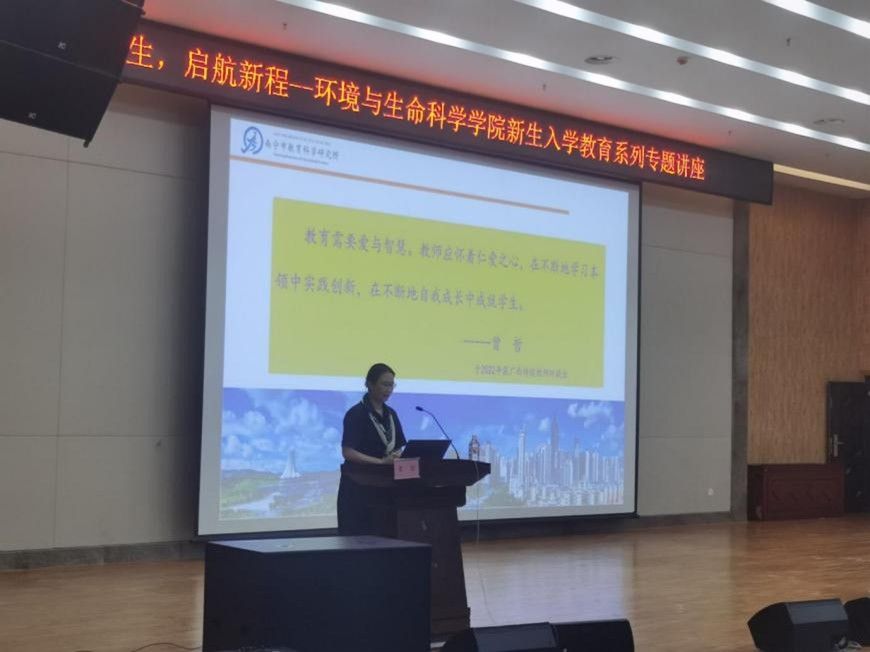 在武鸣校区图书馆一楼报告厅举办2025年“学术启航,领路前行”新生入学教育专题讲座。本次特邀南宁市教育科学研究所生物学科教研员,广西特级教师,正高级教师,南宁师范大学校外硕士研究生导师的曾哲老师开展讲座,曾哲老师长期致力于教育评价改革研究和初中高中新课程改革的实践研究,提出“一标三优四融”教学评一体化教学模式、拔尖创新人才初高中一体化培养途径等教学成果,推动区域教育质量的提升。此次应邀到来,主要以自己从教多年的经验为师生分享成长故事与职业感悟。本次活动由何英姿院长主持,党委书记韦东林、研究生班主任莫莉萍、硕士生导师张鹏飞等教师代表出席本次会议,参会人员还有学科教学(生物)研究生、生物科学专业全体本科生。