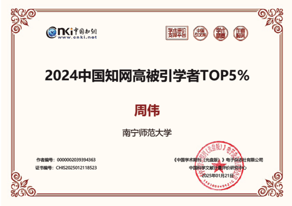 周伟老师入选“2024中国知网高被引学者Top5%”榜单。