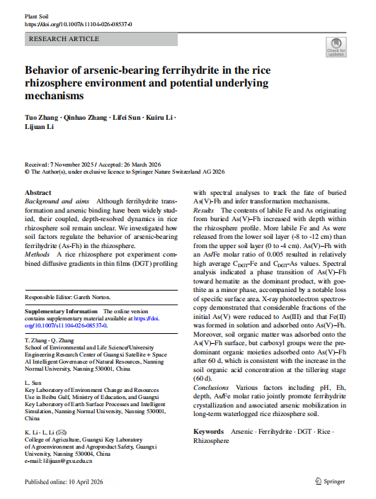 流域污染防治与生态保护重点实验室(团队)在国际农林科学/土壤学领域权威期刊《Plant and Soil》(JCR Q1,新锐分区2区TOP期刊,IF=4.1)发表了题为《Behavior of arsenic‑bearing ferrihydrite in the rice rhizosphere environment and potential underlying mechanisms》论文成果,重点实验室主任张拓副教授为论文第一作者,其指导的硕士研究生张钦豪为论文第二作者,南宁师范大学为论文的第一完成单位,该研究首次系统揭示了含砷水铁矿在水稻根际环境中的转化行为及其驱动机制,为南方稻田砷污染修复提供了重要的理论依据。