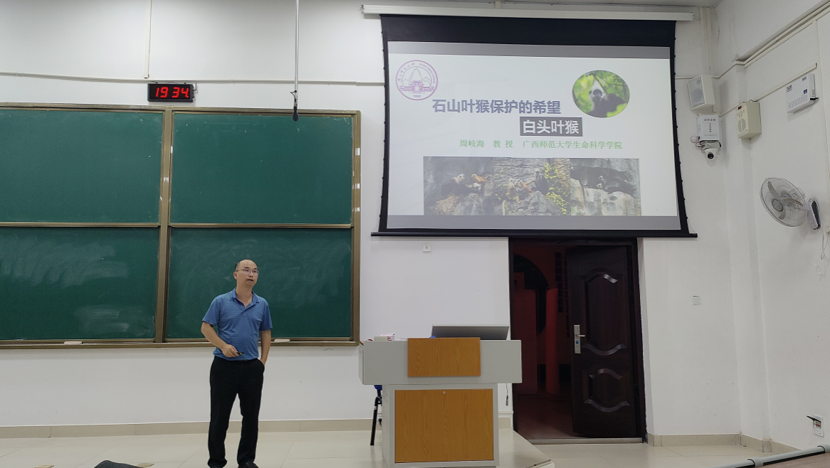 第一场报告中,周教授结合自身丰富的野外调查经历,分享了20多年以来探索白头叶猴的科研经历,使同学们对白头叶猴的生活习性、保护现状以及科研成果有了多方面的了解。周教授还强调了保护濒危动植物,保护生物多样性和生态文明建设的重要性。