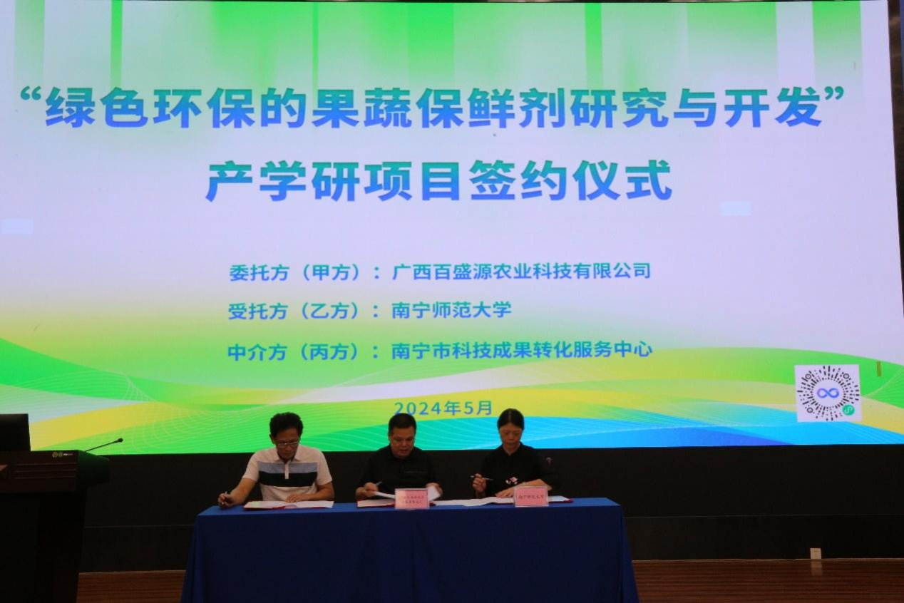 何英姿教授、南宁市科技成果转化服务中心主任杨明慧和广西百盛源农业科技有限公司总经理韦庆文共同签署了“绿色环保的果蔬保鲜剂研究与开发”产学研项目合作协议。随后,何英姿教授与韦庆文总经理进行了产学研合作基地授牌。