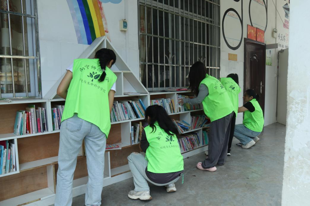实践团成员们集中对学校的“图书角”进行整理,将大小相同的图书整齐排布在书架当中,用抹布和小扫把打扫了角落的灰尘和垃圾,为孩子们整理出了一个干净舒适的读书空间。整个清扫过程中,大朋友和小朋友们都热情高涨。大家齐心协力,迅速使整个校园焕然一新。