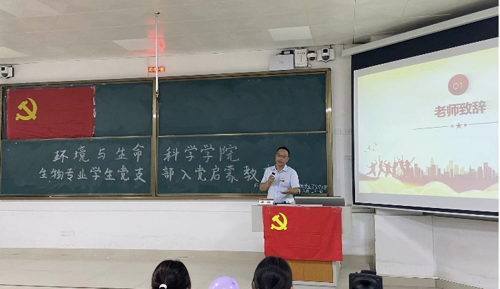 会议伊始,盛凯老师介绍了学院党委的基本情况,强调了新生入党启蒙教育是新生入学教育的重要内容,也是大学生中发展党员的一个重要环节,目的是帮助新生了解党的光辉历程、基本理论知识和入党程序,增强党在青年大学生中的吸引力和凝聚力,引导新生积极向党组织靠拢。他希望新同学们严格要求自我,端正入党动机,坚定理想信念,自觉接受党组织的培养、教育和考察,争取早日成为一名合格的共产党员。