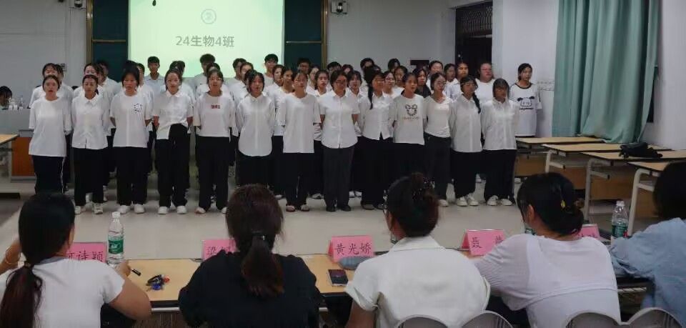 于2024年10月18日在武鸣校区1号教学楼218教室举办“奋楫笃行新时代,齐唱校歌颂芳华”2024级新生校歌比赛初赛。莅临本次比赛的评委有兼职辅导员聂燕、黄光娇,院团委副书记梁佩钰,学生会执行主席何诗颖,学生会主席团成员卢诗晴。