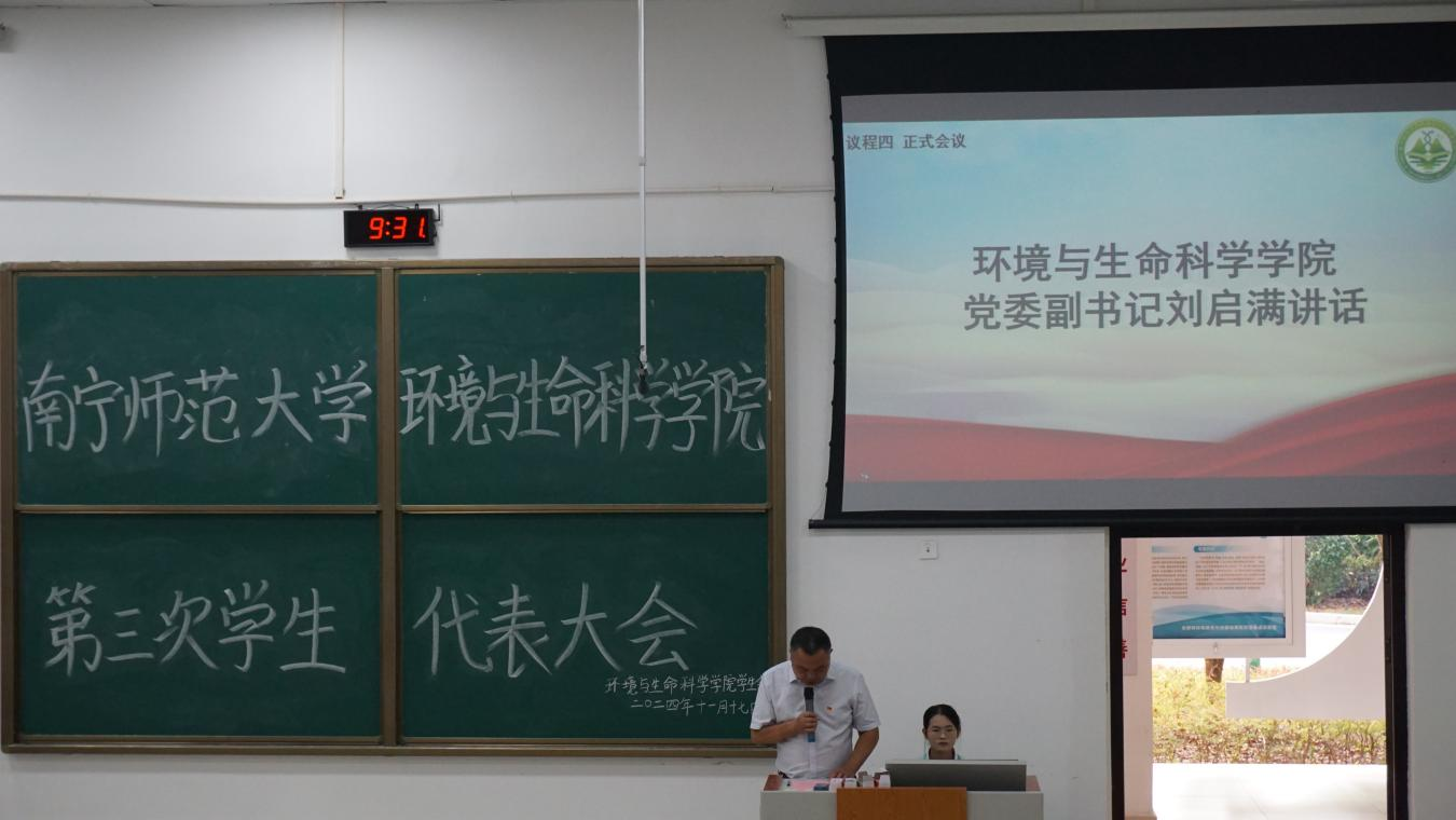 于武鸣校区地海楼B109教室成功召开了第三次学生代表大会,旨在鼓励学生积极参与学院事务,促进学院民主管理,确保学生组织工作的顺利进行,进一步加强学生组织的建设。参加大会的有学院党委副书记刘启满、团委书记刘雅楠、校学生会代表黎英、各二级学院学生会代表、第二届主席团代表、院学生会以及各班级代表。