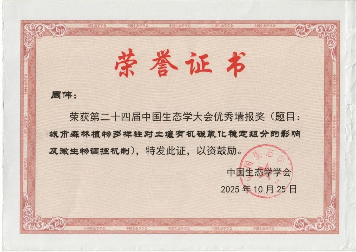 两位同学分别依托立项的国家级、自治区级大学生创新创业训练计划项目,在周伟老师的悉心指导下,围绕城市森林土壤固碳功能及其微生物驱动机制这一前沿主题,完成了从实验设计到数据分析的科研训练,取得初步创新成果。此次获奖既是对学生个人科研潜力与专业素养的肯定,也彰显了 黑料不打烊