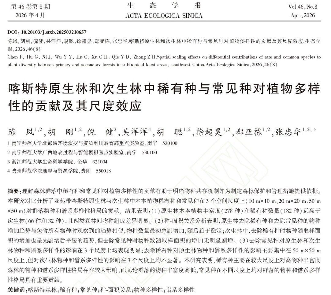 发表于《生态学报》的《喀斯特原生林和次生林中稀有种与常见种对植物多样性的贡献及其尺度效应》研究论文中,团队从种面积关系、物种多样性、谱系多样性等的视角切入,比较了原生林与次生林中木本植物稀有种和常见种对群落物种与谱系多样性的贡献。研究发现,原生林具有更高的物种丰富度,且稀有种对多样性的贡献尤为突出;而次生林的多样性则更依赖于常见种。这种贡献模式随研究空间尺度变化,凸显了生态过程的多尺度性。该研究从生物多样性组分的视角,为评估喀斯特森林恢复状态、识别关键保护对象提供了新的视角。