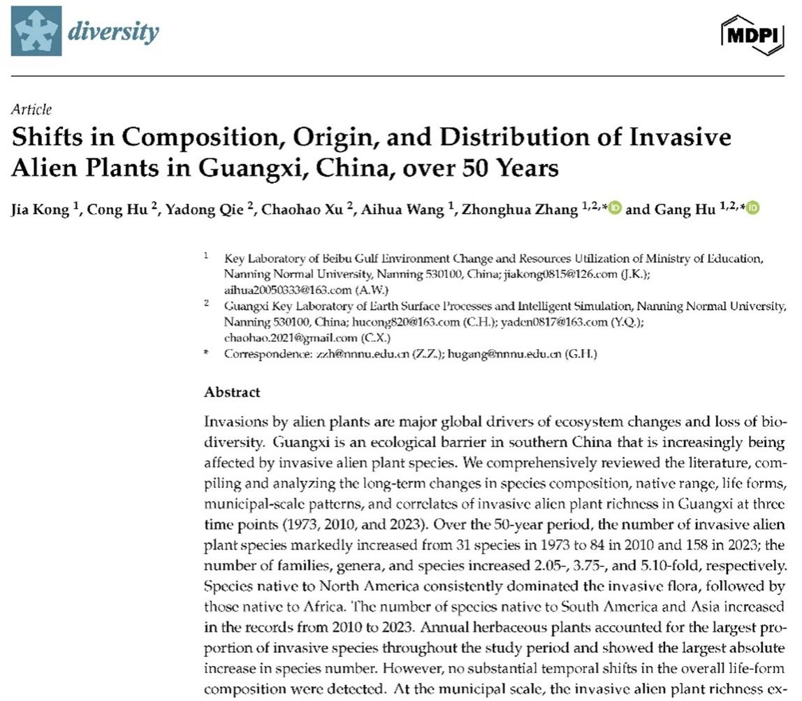 团队在国际期刊《Diversity》上发表了《Shifts in Composition, Origin, and Distribution of Invasive Alien Plants in Guangxi, China, over 50 Years》的研究论文。该研究揭示了过去半个世纪广西外来入侵植物在物种组成、来源地及地理分布上的变化趋势。研究明确了当前入侵植物的主要类群、扩散热点及潜在风险,指出人类活动加剧和气候变化是驱动其动态变化的重要因素。该成果为广西乃至西南地区外来入侵植物的早期预警、监测与综合治理提供了关键的时空动态信息和科学基础。