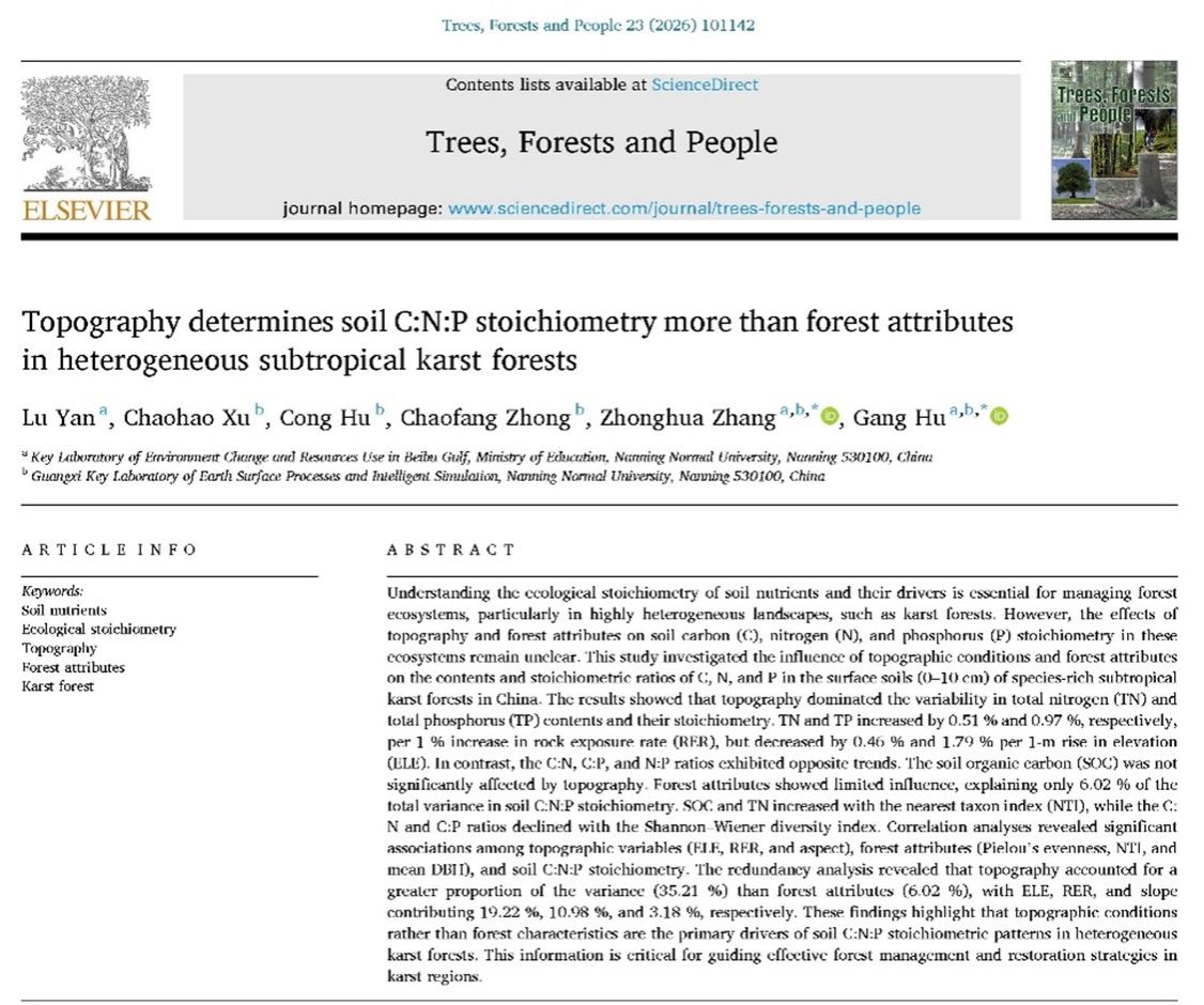 团队在国际期刊《Trees, Forests and People》发表题为《Topography determines soil C:N:P stoichiometry more than forest attributes in heterogeneous subtropical karst forests》的研究论文。该研究探讨了复杂喀斯特生境中森林属性与地形因素对土壤碳氮磷生态化学计量比的影响。研究发现,与森林类型、林龄等属性相比,地形因子(如坡位、坡向)对土壤C:N:P化学计量比的变异具有更强的驱动力。在异质性极强的喀斯特生境中,地形驱动的微环境差异是调节土壤养分平衡和有效性的关键机制。该发现强调了在喀斯特森林管理与恢复实践中,须高度重视地形带来的空间异质性,采取差异化的管理措施。