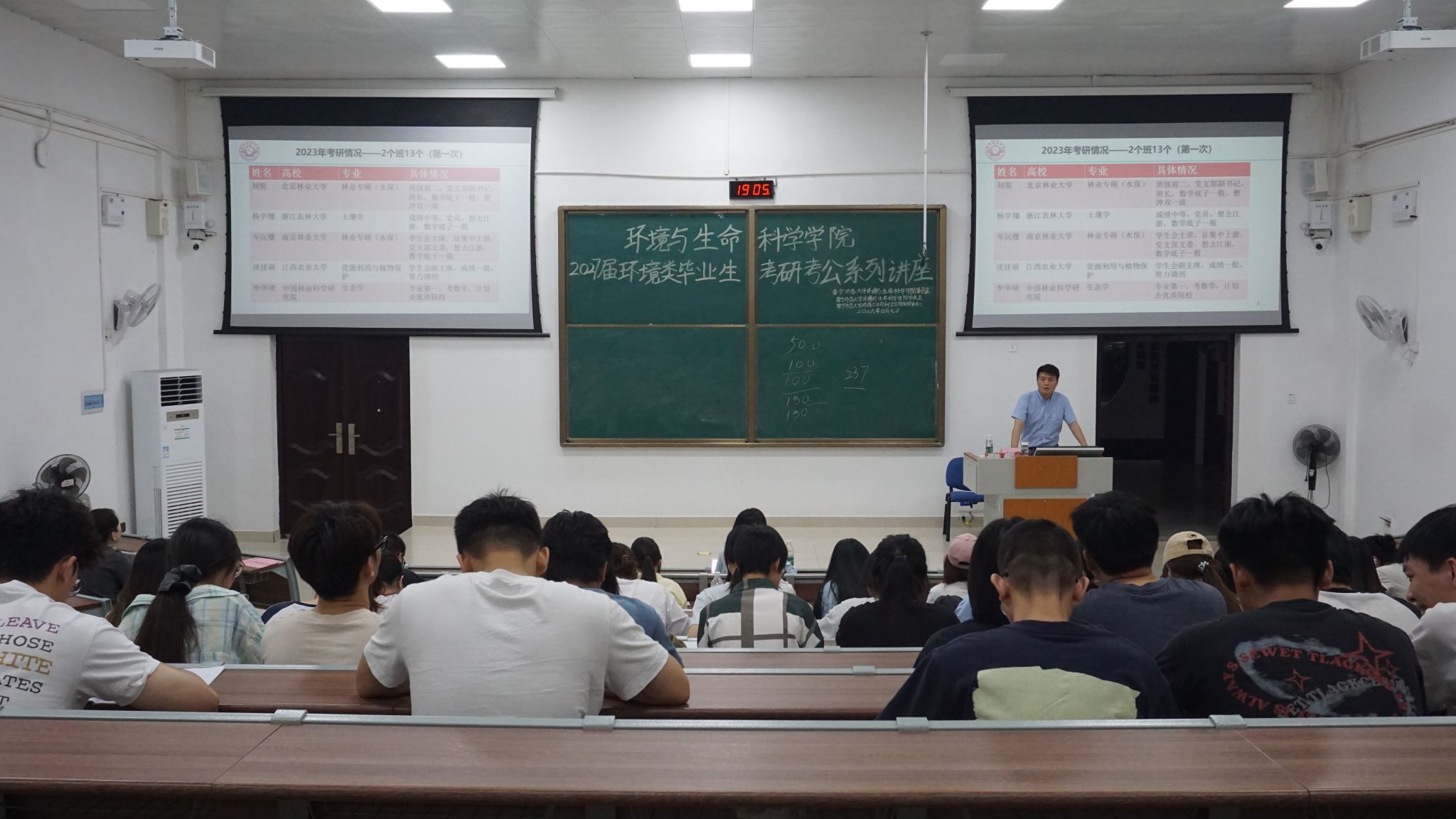 讲座上,曲炳鹏老师围绕环境类专业考研形势展开深入分析。他指出,当前环境类专业报考类型持续丰富,不少毕业生延续往届学子的备考路径,整体考研高分人数逐年上升。结合学院近几届毕业生录取数据,他详细拆解往届学子录取院校、专业分布与备考经验,为在场毕业生提供直观参考。