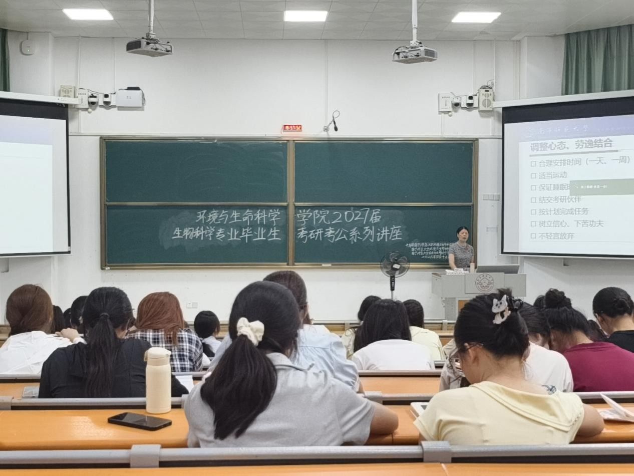 讲座围绕专业选择、全年规划、分阶段复习及心态调整展开,解析学硕与专硕差异、梳理报考方向,明确各阶段复习重点,要科学作息、平稳心态。分享会结合往届优秀学子事迹,介绍16级杨玉梅学姐的备考规划与坚持技巧、21级“硕博之星”黄梦雪备考湖南师范大学的高效方法,以及环境科学专业刘奘平衡学业工作上岸北京林业大学的经历,依托学院逐年递增的上岸率与优良学风,勉励同学们坚定目标、认真备考。