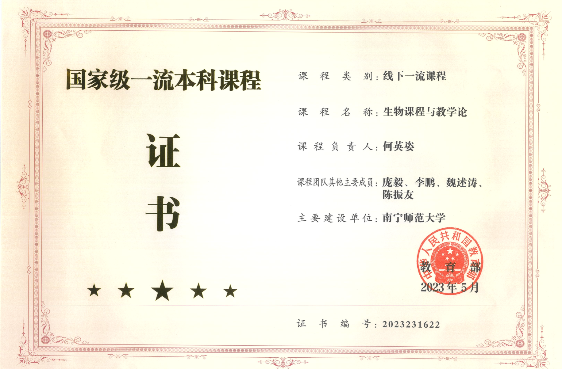 获得学生的喜爱,每届学生评价均在95分以上。本课程理念和做法获得了广西大学、广西民族大学、河池学院等3所区内院校的采纳和借鉴,多位生物学教育专家对课程给予了积极评价。课程已获批为省级一流课程。