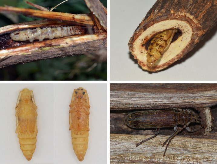 习性:常见于菠萝蜜、柑桔、桑树和柳等多种果树和林木,成虫啃食嫩枝皮层,幼虫钻蛀枝干及根的木质部。