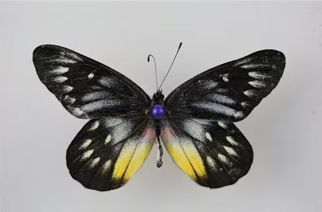 鳞翅目凤蝶科。后翅具黄色或白色斑块,占据第4~7室。与玉斑凤蝶近似,但翅膀背面靠近臀角(后翅最下端的角)的地方全是黑色,没有红色斑点,而翅膀反面靠近边缘的一列斑点是黄色的。