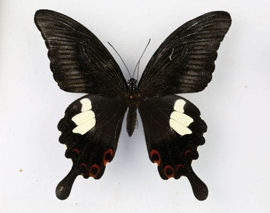 鳞翅目凤蝶科。大型风蝶,后翅具白色斑块,占据5、6、7室,但不进入4室。后翅臀角至少有一个清晰的红色月牙状斑纹,翅膀反面靠近外缘的斑点列也是红色的。
