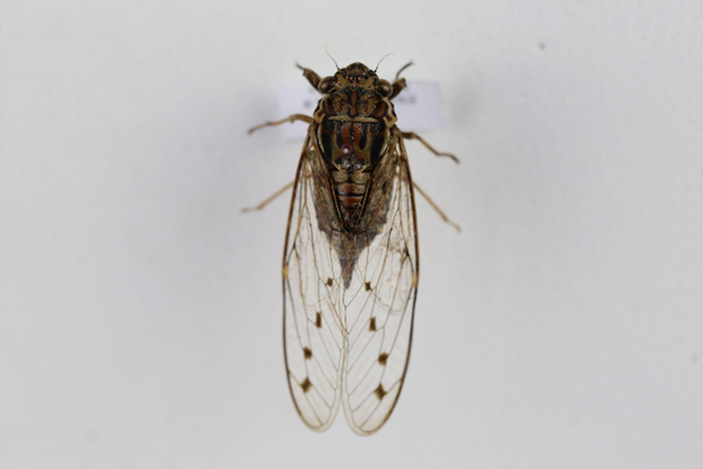 半翅目蝉科。体背红褐色,身上布满了银白色的短毛。雄腹长于头胸,雌腹稍短于头胸。单眼浅桔黄,复眼灰褐色突出。后唇基隆起,具黑色纵带及两侧横纹。喙管绿褐,末端黑,超第2腹节。前胸背板具黑色纵带,中胸背板有五条黑色纵带。前后翅透明,前翅端室基部的横脉上有深褐色的斑点。腹部背面红褐色,具黑斑,第3、4腹板瘤突大。雄尾节小,抱钩合并;雌尾节具端刺,产卵管的外壳稍伸出腹部末端。
