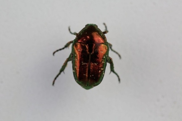 鞘翅目金龟科。体长7~12mm小型,长椭圆形,鞘翅基部稍后处最宽。除鞘翅外,体青铜色,带金属光泽。鞘翅黄褐色,略带金属绿色光泽。腹部第1~5节外侧有白毛。