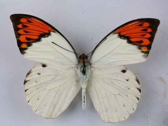鳞翅目粉蝶科。大型粉蝶,翅正面白色,前翅顶端有红色的斑块,翅膀反面布满了褐色的细小纹路,容易辨别。