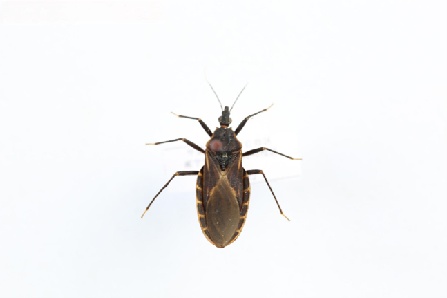半翅目猎蝽科。体浅褐色,具黄褐色斑纹。雌虫体长23mm,头长4mm,头顶宽1.1mm;喙直。小盾片中部具皱纹,顶角短尖。前翅长14mm,不达腹末,体宽8.8mm,向两侧扩展。雄虫腹部末端用于交配的阳基侧突前端突出明显;阳茎内部的侧突长椭圆形、无小刺,中突骨化强、两侧不平行、端缘中央呈锐角突(因观察角度异)。