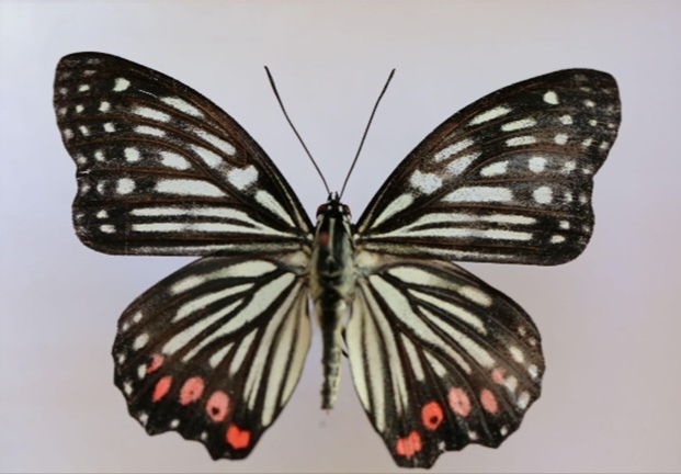 鳞翅目蛱蝶科。有多型现象,常见型翅膀上的斑纹主要是纵向的黑白条纹,后翅靠近边缘的地方有一列红色斑点,非常显眼;还有一种淡色型,几乎只有翅膀上的脉络是黑色的,后翅的红色斑点也消失了。